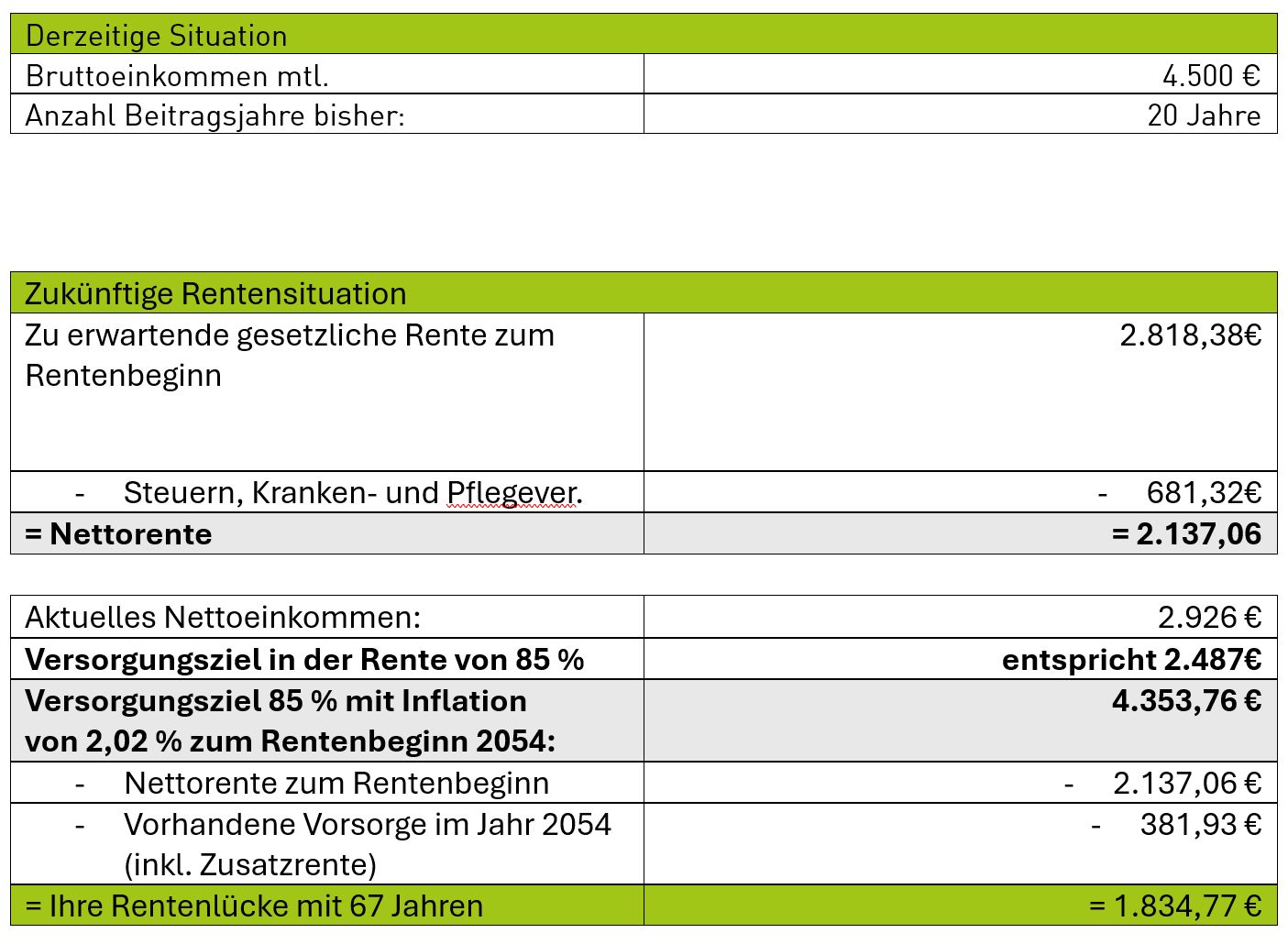 Wie das Rechenbeispiel zeigt, kann die Nichtberücksichtigung der Inflation zu erheblichen Abweichungen bei der tatsächlichen Rentenlücke führen. Zwar wird die gesetzliche Rente jährlich angepasst, doch die Inflation steigt oft schneller – und damit sinkt die reale Kaufkraft im Ruhestand.